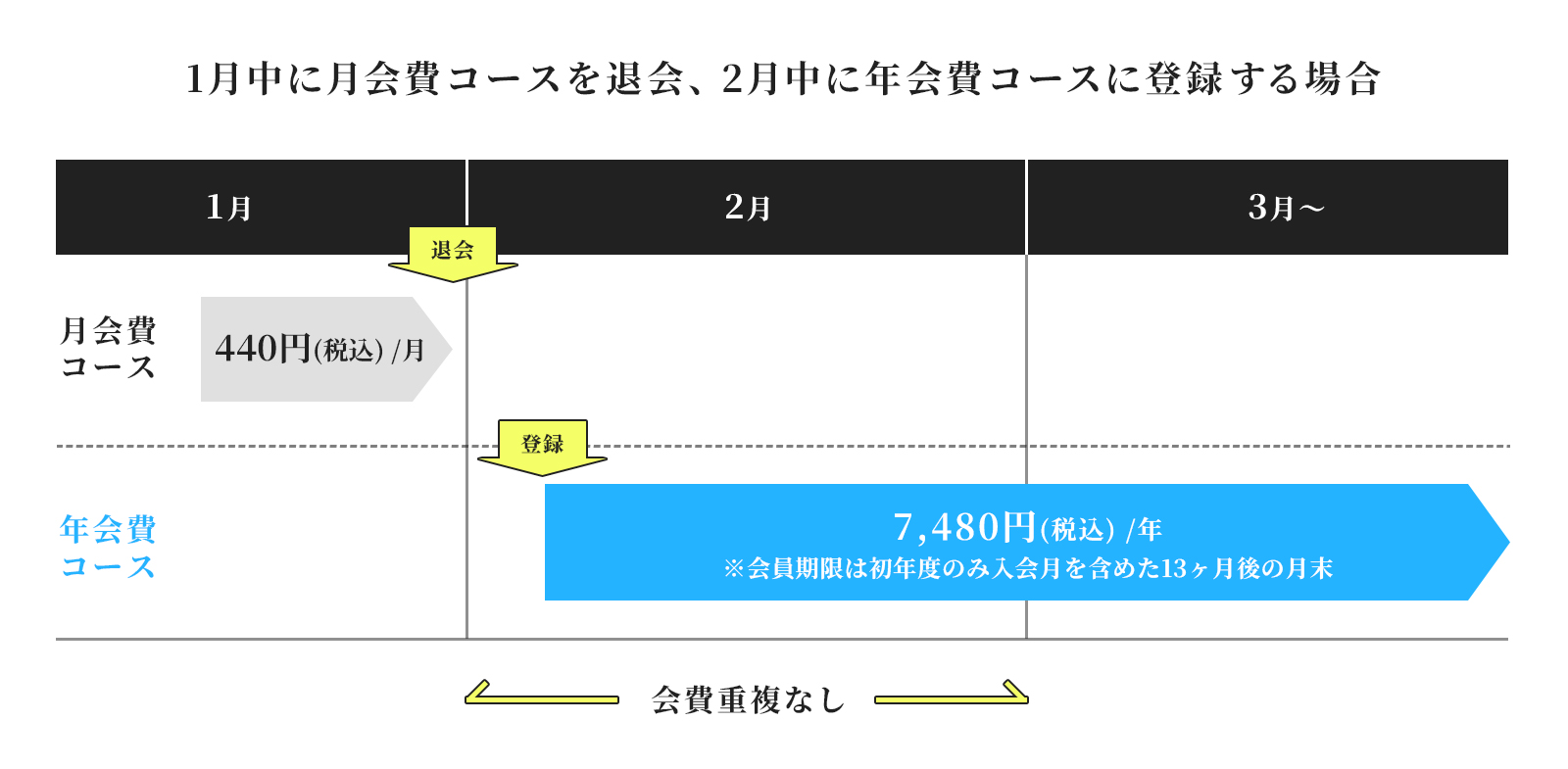 月会費コースを退会後、翌月に年会費コースに登録する場合