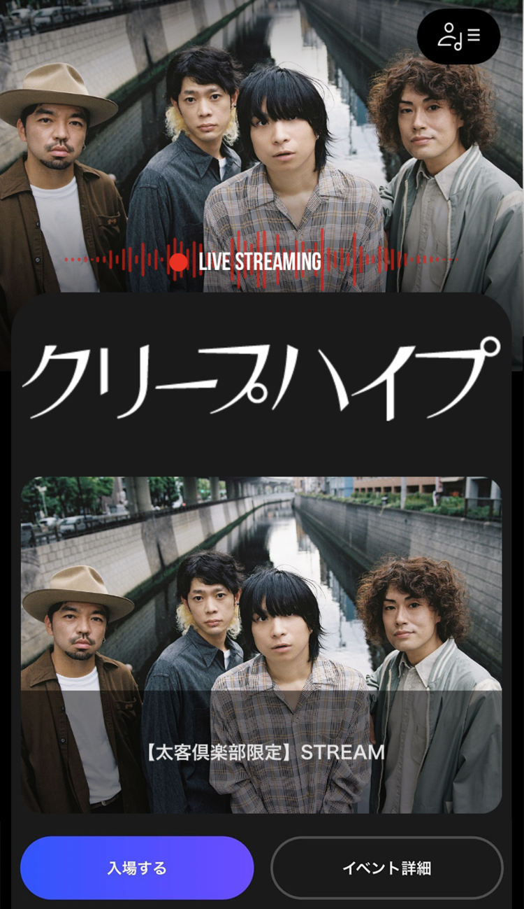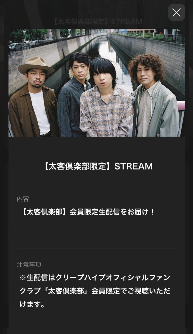 (アイテム購入は可能ですが、本配信での使用はできませんのでご了承ください。) - ・STREAMはクリープハイプ「太客倶楽部」限定コンテンツとなります。スクリーンショット、画面録画/録音の操作は禁止とさせていただきます。